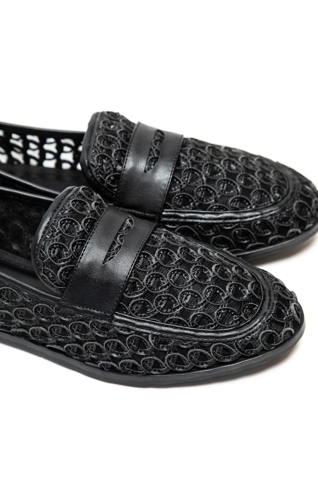 Chata Liguria Negro, un modelo tipo mocasín pensado para quienes buscan comodidad y distinción. Su diseño destaca por la delicada confección en material bordado sobre tul, aportando un toque artesanal y sofisticado a tu look.